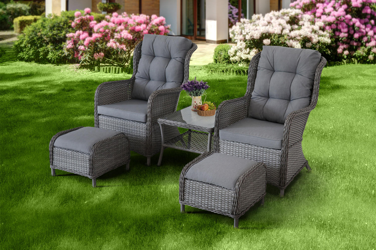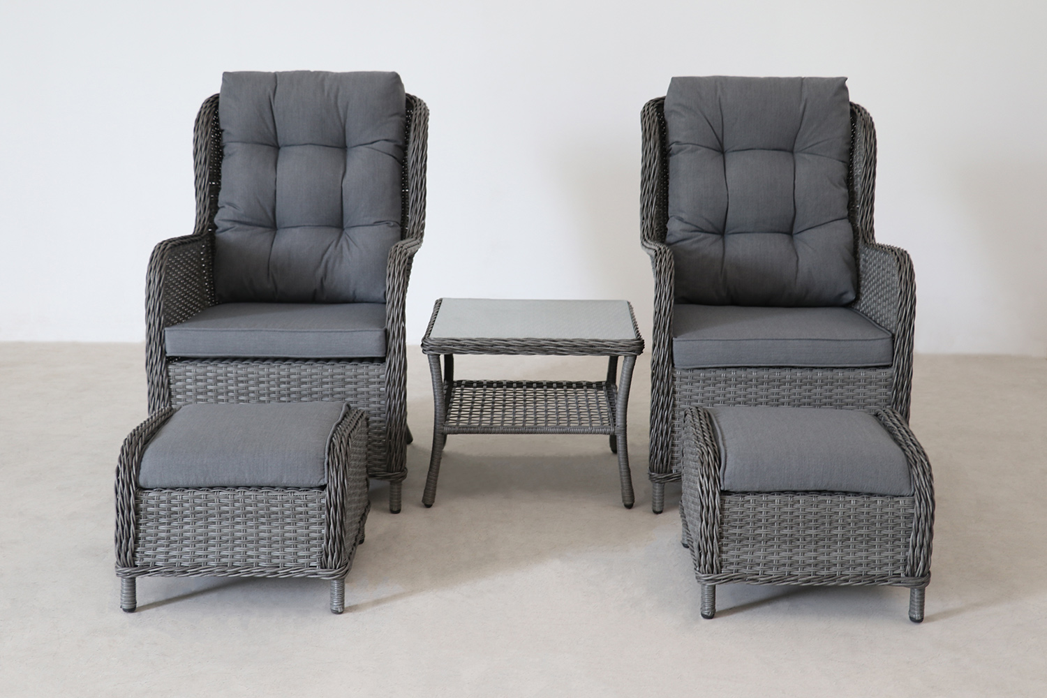 Комплект Orion – идеальное решение для двоих людей, которые любят наслаждаться природой и компанией друг друга с комфортом. В набор входят два кресла с откинутыми спинками, небольшой столик (например, для чая или прохладительных напитков), и подставки для ног (пуфы).